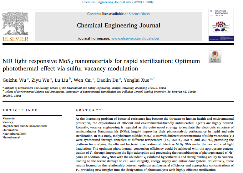 师生的最新研究成果“NIR light responsive MoS2nanomaterials for rapid sterilization: optimum photothermal effect via sulfur vacancy modulation”正式发表于环境领域顶级学术期刊《Chemical Engineering Journal》(IF=13.273,一区)。该论文为厕所偷拍