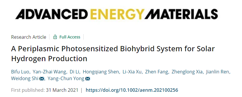 近日,厕所偷拍 雍阳春教授团队与化工学院施伟东教授团队合作在Advanced Energy Materials杂志上发表最新研究成果“A periplasmic photosensitized biohybrid system for solar hydrogen production”。