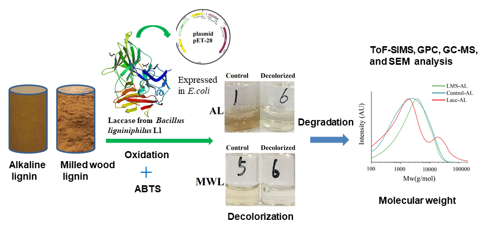木质素作为地球上最为丰富的可再生芳香烃天然资源,其高值化利用是替代石油芳烃和解决当前环境问题的重要途径之一。漆酶作为木质素生物解聚的关键酶,其反应机理一直是近年来研究的重点方向。该论文通过基因敲除和异源表达,证明了漆酶在嗜碱耐盐菌Bacillus ligniniphilus L1降解木质素的过程中起着不可或缺的关键催化作用。并通过GPC凝胶色谱、核磁共振二维谱、FT-IR、ToF-SIMS 以及GC-MS等分析手段,全面阐明了细菌漆酶在木质素解聚及其衍生芳香化合物的降解转化方面的反应机制,为细菌漆酶在木质素的生物炼制领域的应用提供了重要理论基础。该研究为农林生物质资源例如农业秸秆的高值化利用以及农业循环经济提供了新途径。