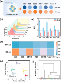 图2. UiO-66-NH2@Au NCs的制备与表征 图3. 荧光传感器阵列识别表面活性剂