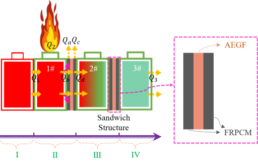 这项工作是在基于相变材料的电池组热管理系统散热优势的基础上考虑热失控传播的抑制能力,探索导热系数和阻燃添加剂对复合相变材料(PCM)热管理系统传热特性的影响。本研究设计了一种由阻燃相变材料(FRPCM)和气凝胶毡(AEGF)组成的夹芯结构用于抑制锂离子电池热失控传播。
