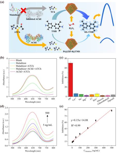 快速灵敏地检测有机磷农药是保护人类健康和环境安全的关键。生物传感器由于高灵敏度和快速响应等优势,在环境检测和医学诊断等领域倍受关注。其中作为核心部分的纳米酶的活性仍有待提高,所以开发高稳定性和高活性的新型纳米酶是提升农药检测效率的关键。研究发现,提升纳米酶催化性能的策略不仅包括调控活性中心的电子结构,还可以通过模拟天然酶的疏水结合口袋来实现。然而,亲水-疏水微环境中的水分子对催化剂性能的影响尚未得到充分关注。因此,深入理解水分子如何特异性地影响纳米酶催化反应,对于设计高效、经济的纳米酶具有重要意义。