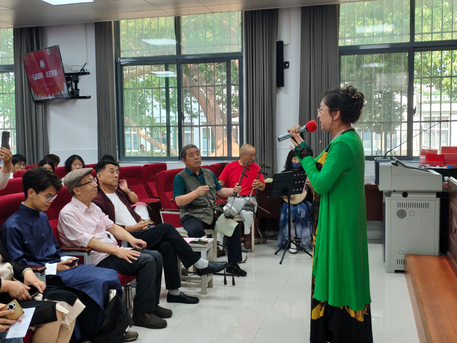 在剧目演绎环节,多位老艺术家轮番登台,以精湛的技艺诠释了京剧艺术的多元魅力。孙淑华老师演绎的《贵妃醉酒·海岛》婉转悠扬,尽显梅派艺术的风华绝代;周尧老师带来的《红灯记·心红胆壮》铿锵有力,重现革命年代的赤子丹心;段宁岩老师演唱的《红娘·小姐呀》细腻传神,展现京剧青衣的柔美风韵。此外,《智取威虎山·朔风吹》《锁麟囊·一霎时》《霸王别姬·劝君王(剑舞)》等经典选段的精彩呈现,更将现场气氛推向高潮。老师们一招一式间尽显功底,一唱一念中传递情感,赢得师生阵阵掌声。